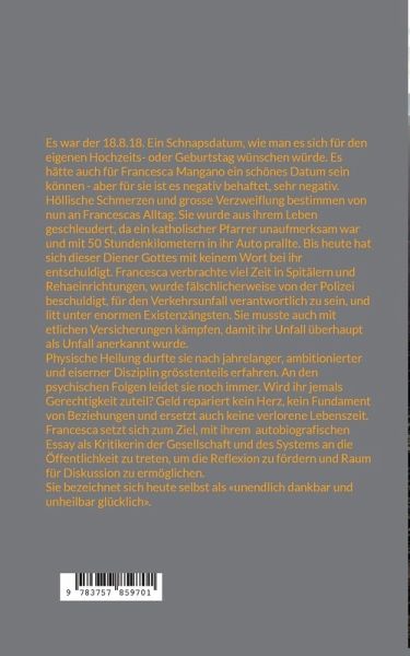 Es war der 18.8.18. Ein Schnapsdatum, wie man es sich für den eigenen Hochzeits- oder Geburtstag wünschen würde. Es hätte auch für Francesca Mangano ein schönes Datum sein können - aber für sie ist es negativ behaftet, sehr negativ.Höllische Schmerzen und grosse Verzweiflung bestimmen von nun an Francescas Alltag. Sie wurde aus ihrem Leben geschleudert, da ein katholischer Pfarrer unaufmerksam war und mit 50 Stundenkilometern in ihr Auto prallte. Bis heute hat sich dieser Diener Gottes mit keinem Wort bei ihr entschuldigt. Francesca verbrachte viel Zeit in Spitälern und Rehaeinrichtungen, wurde fälschlicherweise von der Polizei beschuldigt, für den Verkehrsunfall verantwortlich zu sein, und litt unter enormen Existenzängsten. Sie musste auch mit etlichen Versicherungen kämpfen, damit ihr Unfall überhaupt als Unfall anerkannt wurde.Physische Heilung durfte sie nach jahrelanger, ambitionierter und eiserner Disziplin grösstenteils erfahren. An den psychischen Folgen leidet sie noch immer. Wird ihr jemals Gerechtigkeit zuteil? Geld repariert kein Herz, kein Fundament von Beziehungen und ersetzt auch keine verlorene Lebenszeit.Francesca setzt sich zum Ziel, mit ihrem autobiografischen Essay als Kritikerin der Gesellschaft und des Systems an die Öffentlichkeit zu treten, um die Reflexion zu fördern und Raum für Diskussion zu ermöglichen.Sie bezeichnet sich heute selbst als «unendlich dankbar und unheilbar glücklich».