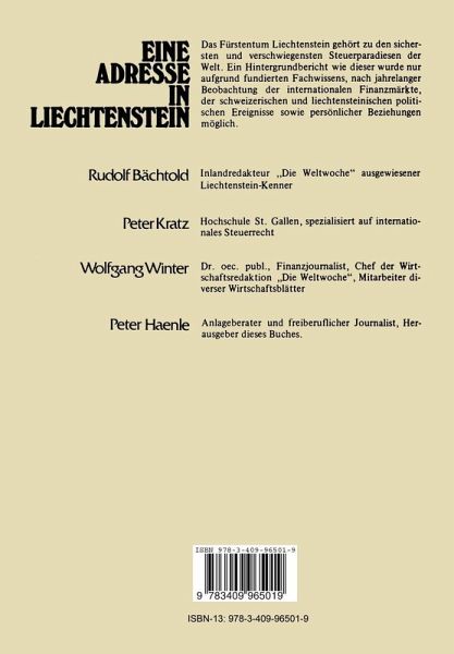 1. Fürstentum Liechtenstein - ein Staat stellt sich vor.- - So entstand Liechtenstein.- - Von Österreich zur Schweiz.- - Liechtenstein? - Was für ein Stein, bitte?.- - Fürst, Staat und Politik.- - Die Bedeutung des Gesellschaftswesens.- - Recht und Rechtstaatlichkeit.- - Wirtschaftlicher Aufschwung.- 2. Wirtschaftseinheit mit der Schweiz.- - Der Zollvertrag.- - Währungs- und Konjunkturpolitik.- - Abkommen mit EFTA und EG.- 3. Heißes Geld und ausländischer Fiskus.- - Das verlorene Paradies.- - Die Sache mit den Briefkästen.- - Manchmal ist es schwer, nicht an Flucht zu denken.- - Liechtensteins Verschwiegenheit.- - Drohende Gefahren.- 4. Das Bank- und Treuhandwesen in Liechtenstein.- - Das Bankgeheimnis als Grundlage.- - Die Banken Liechtensteins.- - Das Treuhandwesen.- - Die Grenzen der Leistungsfähigkeit.- 5. Das liechtensteinische Bankkonto.- - Vorüberlegungen des Anlegers.- - Die Konteneröffnung.- - Der laufende Verkehr, Kontenauszüge.- - Das Nummernkonto.- - Die Vollmacht.- - Die Rechtsnachfolge.- - Bankkonto und Gesellschaft in Liechtenstein.- 6. Gesellschafts- und Steuerwesen.- - Mehr Gesellschaften als Einwohner.- - Zum Gesellschaftsrecht.- - Das Öffentlichkeitsregister.- - Personengesellschaften.- - Juristische Personen.- - Die Anstalt.- - Das Treuhandwesen.- - Die Aktiengesellschaft.- - Die Gesellschaft mit beschränkter Haftung.- - Die Stiftung.- - Steuern juristischer Personen.- 7. Eine Holding in Liechtenstein.- - Die Idee der Holding.- - Geeignete Gesellschaftsformen.- - Steuern der Holding.- - Gründung und Gründungskosten der Holding.- - Die Verwaltung der Holding.- - Die Anerkennung durch das Ausland.- 8. Die Holding als Finanzdrehscheibe.- -Hauptaufgabe der Holding.- - Geschichten aus Liechtenstein.- - Der Sinn der Holding.- - Die Aktivitäten der Holding.- - Die Familienstiftung.- - Briefkästen.- - Fallbeispiele.- - Die liechtensteinische Holding als Sprungbrett ins Ausland.- 9. Die liechtensteinische Holding und ein Konto in der Schweiz.- - Funktionen des schweizerischen Kontos.- - Über die Schweiz an den Euromarkt.- - Liechtenstein aus der Sicht der Schweizer Banken.- 10. Liechtenstein und die Multis.- 11. Vermögensverwaltung.- - Vermögensverwaltung - Vermögenserhaltung.- - Die Verwahrung in der Bank.- - Der Bankier als Anlageberater.- - Die umfassende Vermögensverwaltung durch Banken.- - Vermögensverwaltung durch Treuhandunternehmen.- 12. Ausländischer Fiskus und Steuerzahler.- - Druck: Gegendruck - oder Ausweichen.- - Der Fiskus im Ausland.- - Liechtenstein aus der Sicht des ausländischen Steuerzahlers.- - Scheingesellschaften und Briefkästen.- - Steuerumgehung via Liechtenstein.- - Die Folgen des deutschen Außensteuergesetzes.- - Schweizer Fiskus: betont gelassen.- 13. Wohnsitz, aktive Unternehmung und Steuern.- - Wohnsitz für Ausländer.- - Staatsbürgerschaft für Ausländer.- - Die aktive Unternehmung.- - Steuern in Liechtenstein.- - Doppelbesteuerungsabkommen.- 14. Schlußwort.- 15. Anhang.- - Liste der Rechtsanwälte, Rechtsagenten und Treuhänder in Liech tenstein.- - Übersicht über die wichtigsten Anlagemöglichkeiten Liechtensteins und deren Zweckdienlichkeit für den Anleger.- - Nachtrag nach Redaktionsschluß.