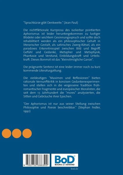 "Sprachkürze gibt Denkweite." (Jean Paul)Die nonfiktionale Kurzprosa des isolierbar pointierten Aphorismus ist leider heruntergekommen zu lustiger Blödelei oder seichtem Gesinnungsspruch und sollte doch rehabilitiert werden als ein philosophischer Gehalt in literarischer Gestalt, als satirisches Zwerg-Rätsel, als paradoxes Erkenntnisspiel zwischen Bild und Begriff, Gefühl und Gedanke, Metapher und Metaphysik, Phantasie und Verstand, Einbildungskraft und Urteilskraft. Dieses Bonmot ist das "kleinstmögliche Ganze". Die prägnante Sentenz ist eine leider immer noch zu kurz kommende Literaturgattung. Die vieldeutigen "Maximen und Reflexionen" bieten rationale Vernunftkritik in konzisen Gedankenexperimenten und stellen sich in die fast vergessene Tradition frühromantischer Fragmente und europäischer Moralisten, die seit dem 17. Jahrhundert die "mores" analysierten, die Sitten und Gebräuche ihrer Epochen."Der Aphorismus ist nur aus seiner Stellung zwischen Philosophie und Poesie beschreibbar." (Stephan Fedler, 1992)