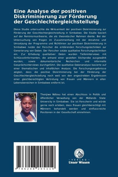 Diese Studie untersuchte die Wirksamkeit der positiven Diskriminierung zur Förderung der Geschlechtergleichstellung in Simbabwe. Die Studie basiert auf der Feminismustheorie, die als theoretischer Rahmen diente. Bei der Untersuchung von Fragen im Zusammenhang mit der Annahme und Umsetzung der Programme und Richtlinien zur positiven Diskriminierung in Simbabwe nutzte der Forscher die erklärenden Forschungstechniken zur Generierung von Daten. Der Forscher setzte qualitative Forschungstechniken ein. Zur Erhebung qualitativer Daten wurden Tiefeninterviews mit Schlüsselinformanten, die anhand einer gezielten Stichprobe ausgewählt wurden, sowie dokumentarische Recherchen und informelle Gesprächsinterviews durchgeführt. Die qualitative Datenanalyse basierte auf einer thematischen und inhaltlichen Analyse. Die Forschungsergebnisse zeigten, dass die positive Diskriminierung bei der Förderung der Geschlechtergleichstellung noch weit von den angestrebten Ergebnissen einer gleichberechtigtenVertretung von Frauen und Männern in allen Lebensbereichen in Simbabwe entfernt ist.