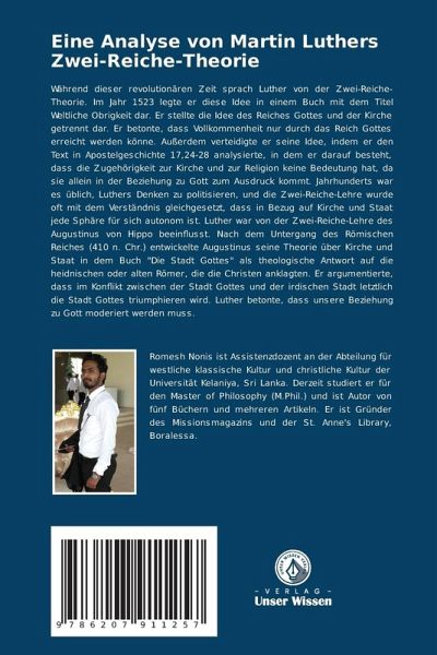 Während dieser revolutionären Zeit sprach Luther von der Zwei-Reiche-Theorie. Im Jahr 1523 legte er diese Idee in einem Buch mit dem Titel Weltliche Obrigkeit dar. Er stellte die Idee des Reiches Gottes und der Kirche getrennt dar. Er betonte, dass Vollkommenheit nur durch das Reich Gottes erreicht werden könne. Außerdem verteidigte er seine Idee, indem er den Text in Apostelgeschichte 17,24-28 analysierte, in dem er darauf besteht, dass die Zugehörigkeit zur Kirche und zur Religion keine Bedeutung hat, da sie allein in der Beziehung zu Gott zum Ausdruck kommt. Jahrhunderts war es üblich, Luthers Denken zu politisieren, und die Zwei-Reiche-Lehre wurde oft mit dem Verständnis gleichgesetzt, dass in Bezug auf Kirche und Staat jede Sphäre für sich autonom ist. Luther war von der Zwei-Reiche-Lehre des Augustinus von Hippo beeinflusst. Nach dem Untergang des Römischen Reiches (410 n. Chr.) entwickelte Augustinus seine Theorie über Kirche und Staat in dem Buch "Die Stadt Gottes" als theologische Antwort auf die heidnischen oder alten Römer, die die Christen anklagten. Er argumentierte, dass im Konflikt zwischen der Stadt Gottes und der irdischen Stadt letztlich die Stadt Gottes triumphieren wird. Luther betonte, dass unsere Beziehung zu Gott moderiert werden muss.