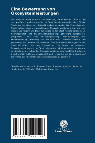 Das Hauptziel dieser Studie ist die Bewertung der Risiken und Chancen, die mit den Ökosystemleistungen in der Stadt Mekelle verbunden sind. Für die Studie wurden Daten aus Sekundärquellen verwendet. Die Ergebnisse der Studie zeigen, dass es verschiedene Ökosystemleistungen gibt, die eine Vielzahl von Gütern und Dienstleistungen in der Stadt Mekelle bereitstellen. Nahrungsmittel- und Frischwasserversorgung, genetische Ressourcen, Luftqualität, Klima- und Wasserregulierung, Wasserreinigung und Abfallbehandlung, Erholung und Ökotourismus, Nährstoffkreislauf und Wasserkreislauf wurden als relevante Ökosystemdienstleistungen in der Stadt identifiziert. Um den Zustand und die Trends der relevanten Ökosystemleistungen in der Stadt zu bewerten, wird eine detaillierte Analyse des Zustands der relevanten Ökosystemleistungen durchgeführt. Zu diesem Zweck werden Indikatoren ausgewählt und verwendet, um den Zustand und die Trends der relevanten Ökosystemleistungen zu bewerten.