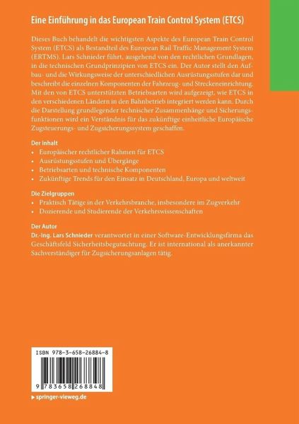 Dieses Buch behandelt die wichtigsten Aspekte des European Train Control System (ETCS) als Bestandteil des European Rail Traffic Management System (ERTMS). Lars Schnieder führt, ausgehend von den rechtlichen Grundlagen, in die technischen Grundprinzipien von ETCS ein. Der Autor stellt den Aufbau- und die Wirkungsweise der unterschiedlichen Ausrüstungsstufen dar und beschreibt die einzelnen Komponenten der Fahrzeug- und Streckeneinrichtung. Mit den von ETCS unterstützten Betriebsarten wird aufgezeigt, wie ETCS in den verschiedenen Ländern in den Bahnbetrieb integriert werden kann. Durch die Darstellung grundlegender technischer Zusammenhänge und Sicherungsfunktionen wird ein Verständnis für das zukünftige einheitliche Europäische Zugsteuerungs- und Zugsicherungssystem geschaffen.