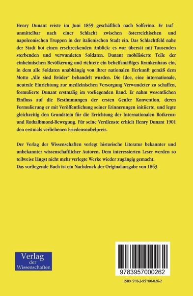 Henry Dunant reiste im Juni 1859 geschäftlich nach Solferino. Er traf unmittelbar nach einer Schlacht zwischen österreichischen und napoleonischen Truppen in der italienischen Stadt ein. Das Schlachtfeld nahe der Stadt bot einen erschreckenden Anblick: es war übersät mit Tausenden sterbenden und verwundeten Soldaten. Dunant mobilisierte Teile der einheimischen Bevölkerung und richtete ein behelfsmäßiges Krankenhaus ein, in dem alle Soldaten unabhängig von ihrer nationalen Herkunft gemäß dem Motto Alle sind Brüder behandelt wurden. Die Idee, eine internationale, neutrale Einrichtung zur medizinischen Versorgung Verwundeter zu schaffen, formulierte Dunant erstmalig im vorliegenden Band. Er nahm wesentlichen Einfluss auf die Bestimmungen der ersten Genfer Konvention, deren Formulierung er mit Veröffentlichung seiner Erinnerungen initiierte, und legte gleichzeitig den Grundstein für die Errichtung der Internationalen Rotkreuz- und Rothalbmond-Bewegung. Für seine Verdienste erhielt Henry Dunant 1901 den erstmals verliehenen Friedensnobelpreis.