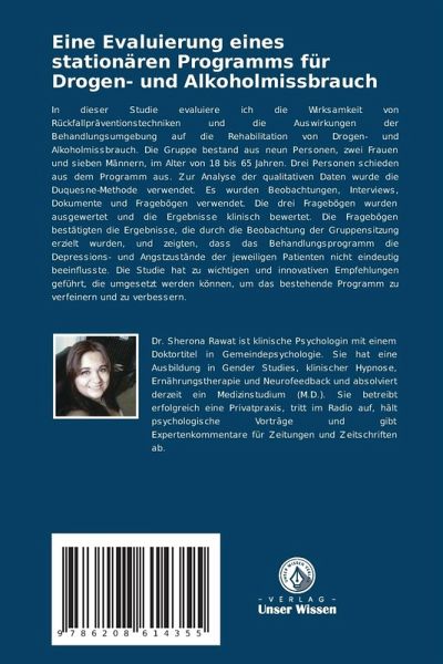 In dieser Studie evaluiere ich die Wirksamkeit von Rückfallpräventionstechniken und die Auswirkungen der Behandlungsumgebung auf die Rehabilitation von Drogen- und Alkoholmissbrauch. Die Gruppe bestand aus neun Personen, zwei Frauen und sieben Männern, im Alter von 18 bis 65 Jahren. Drei Personen schieden aus dem Programm aus. Zur Analyse der qualitativen Daten wurde die Duquesne-Methode verwendet. Es wurden Beobachtungen, Interviews, Dokumente und Fragebögen verwendet. Die drei Fragebögen wurden ausgewertet und die Ergebnisse klinisch bewertet. Die Fragebögen bestätigten die Ergebnisse, die durch die Beobachtung der Gruppensitzung erzielt wurden, und zeigten, dass das Behandlungsprogramm die Depressions- und Angstzustände der jeweiligen Patienten nicht eindeutig beeinflusste. Die Studie hat zu wichtigen und innovativen Empfehlungen geführt, die umgesetzt werden können, um das bestehende Programm zu verfeinern und zu verbessern.