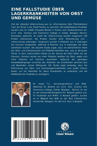 Ziel der aktuellen Untersuchung war es, Informationen über Pilzinfektionen nach der Ernte in der Stadt Tumkur zu sammeln. Die pilzbefallenen Produkte wurden vom Sri Siddhi Vinayaka Market in Tumkur zum Studienzentrum am J.S.S. Arts, Science and Commerce College in Gokak, Belagavi District, Karnataka, gebracht. Im Laufe der Untersuchung wurden insgesamt 150 Proben entnommen. Die Proben wurden einer Pilzisolierung und -untersuchung unterzogen. Insgesamt wurden 9 Pilzarten aus 6 Gattungen bei Gemüse festgestellt, während 8 Pilzarten aus 8 Gattungen bei Obst identifiziert wurden. Die aktuelle Studie ergab, dass ein beträchtlicher Anteil der Obst- und Gemüsesorten von Pilzbefall betroffen war, was zu Verlusten führte. In dem untersuchten Gebiet ist der Verlust bei Obst höher als bei Gemüse. Gemüse wurde von mehr Pilzarten befallen als Obst, wobei sich mehr Pilzarten auf Gemüse auswirkten. Aufgrund der günstigen Umweltbedingungen erreichte das Auftreten von Krankheiten zwischen Juni und November seinen Höhepunkt. Die Studie zeigt eindeutig, dass die Erforschung von Obst- und Gemüselagerkrankheiten eine große Chance bietet, um ein Heilmittel für diese Krankheiten zu entwickeln und die Haltbarkeit der Produkte zu verlängern.