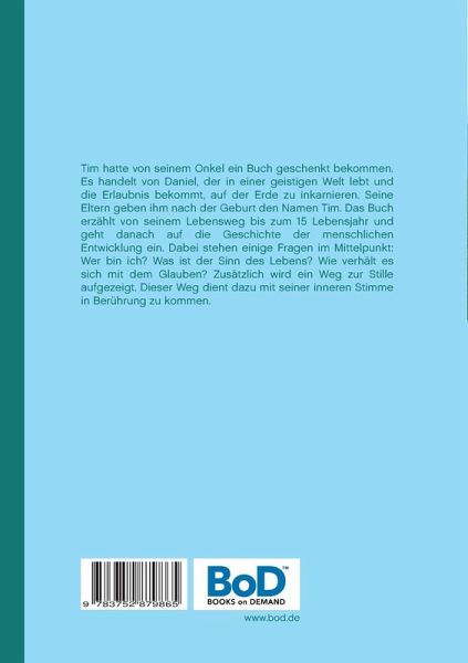 Tim hatte von seinem Onkel ein Buch geschenkt bekommen. Es handelt von Daniel, der in einer geistigen Welt lebt und die Erlaubnis bekommt, auf der Erde zu inkarnieren. Seine Eltern geben ihm nach der Geburt den Namen Tim. Das Buch erzählt von seinem Lebensweg bis zum 15 Lebensjahr und geht danach auf die Geschichte der menschlichen Entwicklung ein. Dabei stehen einige Fragen im Mittelpunkt: Wer bin ich? Was ist der Sinn des Lebens? Wie verhält es sich mit dem Glauben? Zusätzlich wird ein Weg zur Stille aufgezeigt. Dieser Weg dient dazu mit seiner inneren Stimme in Berührung zu kommen. Eine Geschichte die zur Heilung der Welt beitragen könnte.