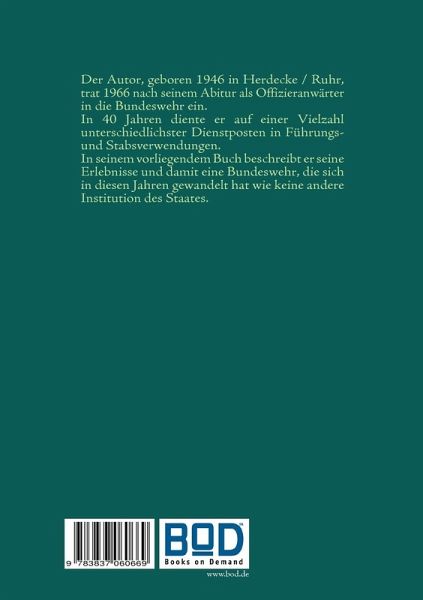 Der Autor, geboren 1946 in Herdecke / Ruhr, trat 1966 nach seinem Abitur als Offizieranwärter in die Bundeswehr ein. In 40 Jahren diente er auf einer Vielzahl unterschiedlichster Dienstposten in Führungs- und Stabsverwendungen. In seinem vorliegendem Buch beschreibt er seine Erlebnisse und damit eine Bundeswehr, die sich in diesen Jahren gewandelt hat wie keine andere Institution des Staates.