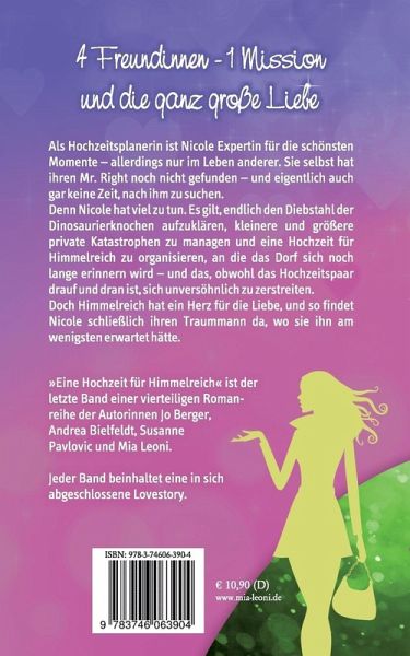 Der Abschluss der Himmelreich-Reihe mit einer weiteren lustig-romantischen Liebesgeschichte.Der Roman ist Teil einer Reihe, beinhaltet jedoch eine größtenteils abgeschlossene Liebesgeschichte und kann auch einzeln gelesen werden.Als Hochzeitsplanerin ist Nicole Expertin für die schönsten Momente - allerdings nur im Leben anderer. Sie selbst hat ihren Mr. Right noch nicht gefunden - und eigentlich auch gar keine Zeit, nach ihm zu suchen.Denn Nicole hat viel zu tun. Es gilt, endlich den Diebstahl der Dinosaurierknochen aufzuklären, kleinere und größere private Katastrophen zu managen und eine Hochzeit für Himmelreich zu organisieren, an die das Dorf sich noch lange erinnern wird - und das, obwohl das Hochzeitspaar drauf und dran ist, sich unversöhnlich zu zerstreiten.Doch Himmelreich hat ein Herz für die Liebe, und so findet Nicole schließlich ihren Traummann da, wo sie ihn am wenigsten erwartet hätte.Das herzerfrischende Finale der zweiten Himmelreich-Staffel zeigt Himmelreich in Höchstform."Eine Hochzeit für Himmelreich" ist der Abschluss zu einer vierteiligen Romanreihe der Autorinnen Jo Berger, Andrea Bielfeldt, Susanne Pavlovic und Mia Leoni.