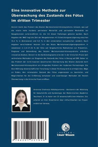 Derzeit bleibt das Problem des fetalen Wachstumsrestriktionssyndroms relevant, was auf die relativ hohe Inzidenz perinataler Mortalität und perinataler Morbidität bei Neugeborenen zurückzuführen ist, die mit dieser Pathologie geboren wurden. Nach Angaben der WHO liegt die Zahl der Neugeborenen mit Entwicklungsverzögerung zwischen 31,1 % in Zentralasien und 6,5 % in den entwickelten europäischen Ländern. Nach Angaben verschiedener Autoren tritt das fetale Wachstumsverzögerungssyndrom in Usbekistan in 2,4-17-25 % der Fälle auf. Vorgeburtliche Maßnahmen zur Prävention, Diagnose und Behandlung des fetalen Wachstumsrestriktionssyndroms erfordern innovative Ansätze. Derzeit ist die Kardiotokographie eine der in der klinischen Praxis weit verbreiteten Methoden zur Diagnose des Zustands des Fötus in Bezug auf ORP. Daher ist das Problem der nicht-invasiven dynamischen Überwachung des fetalen Zustands beim Wachstumsrestriktionssyndrom ein dringendes Problem der modernen Perinatologie. Die Durchführung wissenschaftlicher Forschung in dieser Richtung wird es ermöglichen, Wege zu finden, den intranatalen Zustand des Fötus angemessen zu beurteilen, und Möglichkeiten für die Einführung komplexer und zuverlässiger Methoden der fetalen Überwachung in die klinische Praxis eröffnen.