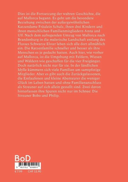 Dies ist die Fortsetzung der wahren Geschichte, die auf Mallorca begann. Es geht um die besondere Beziehung zwischen der außergewöhnlichen Katzendame Fräulein Schulz, ihren drei Kindern und ihren menschlichen Familienmitgliedern Anna und Ulf. Nach dem aufregenden Umzug von Mallorca nach Brandenburg in die malerische Landschaft entlang des Flusses Schwarze Elster leben sich alle dort allmählich ein. Die Katzenfamilie schneller und besser als ihre Menschen es je gedacht hatten. Auch hier, wie vorher auf Mallorca, ist die Umgebung mit Feldern, Wiesen und Wäldern wie geschaffen für die vier Freigänger. Doch natürlich nicht nur für sie. In der ländlichen Idylle kümmern sich viele Familien um samtpfotige Mitglieder. Aber es gibt auch die Zurückgelassenen, die Ent-laufenen und kleine Abenteurer die weniger Glück im Leben hatten und ohne Familienanschluss als Streuner auf sich allein gestellt sind. Zwei davon hinterlassen ihre Spuren nicht nur im Schnee: Die Streuner Bobo und Philip.