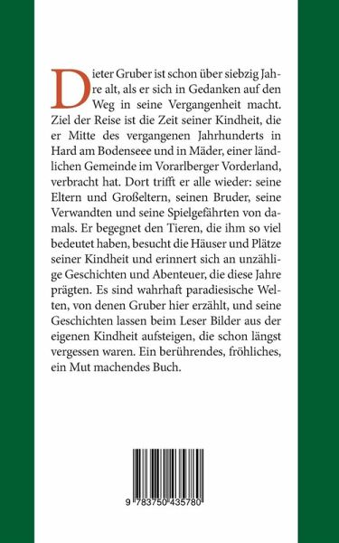 Dieter Gruber ist schon über siebzig Jahre alt, als er sich in Gedanken auf den Weg in seine Vergangenheit macht. Ziel der Reise ist die Zeit seiner Kindheit, die er Mitte des vergangenen Jahrhunderts in Hard am Bodensee und in Mäder, einer ländlichen Gemeinde im Vorarlberger Vorderland, verbracht hat. Dort trifft er alle wieder: seine Eltern und Großeltern, seinen Bruder, seine Verwandten und seine Spielgefährten von damals. Er begegnet den Tieren, die ihm so viel bedeutet haben, besucht die Häuser und Plätze seiner Kindheit und erinnert sich an unzählige Geschichten und Abenteuer, die diese Jahre prägten. Es sind wahrhaft paradiesische Welten, von denen Gruber hier erzählt, und seine Geschichten lassen beim Leser Bilder aus der eigenen Kindheit aufsteigen, die schon längst vergessen waren. Ein berührendes, fröhliches, ein Mut machendes Buch.