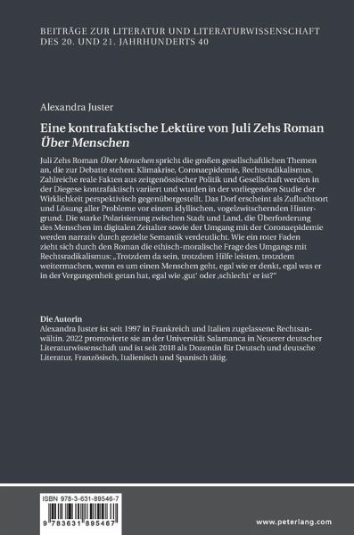 Juli Zehs Roman Über Menschen spricht die großen gesellschaftlichen Themen an, die zur Debatte stehen: Klimakrise, Coronaepidemie, Rechtsradikalismus. Zahlreiche reale Fakten aus zeitgenössischer Politik und Gesellschaft werden in der Diegese kontrafaktisch variiert und wurden in der vorliegenden Studie der Wirklichkeit perspektivisch gegenübergestellt. Das Dorf erscheint als Zufluchtsort und Lösung aller Probleme vor einem idyllischen, vogelzwitschernden Hintergrund. Die starke Polarisierung zwischen Stadt und Land, die Überforderung des Menschen im digitalen Zeitalter sowie der Umgang mit der Coronaepidemie werden narrativ durch gezielte Semantik verdeutlicht. Wie ein roter Faden zieht sich durch den Roman die ethisch-moralische Frage des Umgangs mit Rechtsradikalismus: "Trotzdem da sein, trotzdem Hilfe leisten, trotzdem weitermachen, wenn es um einen Menschen geht, egal wie er denkt, egal was er in der Vergangenheit getan hat, egal wie 'gut' oder 'schlecht' er ist?"