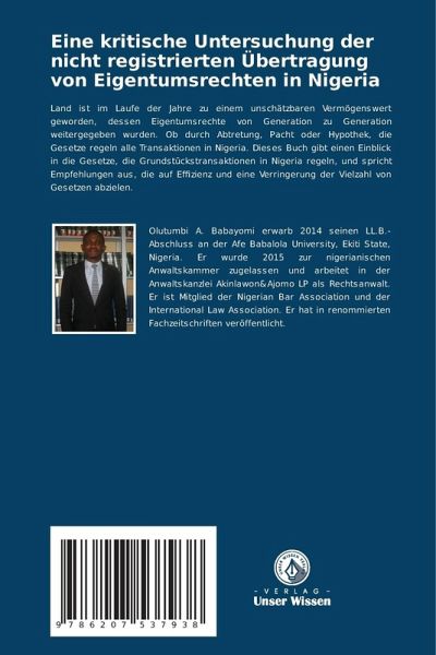 Land ist im Laufe der Jahre zu einem unschätzbaren Vermögenswert geworden, dessen Eigentumsrechte von Generation zu Generation weitergegeben wurden. Ob durch Abtretung, Pacht oder Hypothek, die Gesetze regeln alle Transaktionen in Nigeria. Dieses Buch gibt einen Einblick in die Gesetze, die Grundstückstransaktionen in Nigeria regeln, und spricht Empfehlungen aus, die auf Effizienz und eine Verringerung der Vielzahl von Gesetzen abzielen.