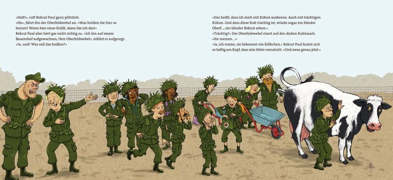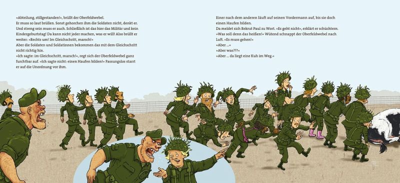 Statt ordentlich und diszipliniert zu marschieren, purzeln die Rekruten fast übereinander: Eine Kuh liegt im Weg, mitten auf dem Truppenübungsplatz. Und ganz egal, wie laut der Oberfeldwebel brüllt: diese Kuh bringt ein Kälbchen zur Welt und zwar genau hier und jetzt. Manche Dinge lassen sich einfach nicht aufhalten.