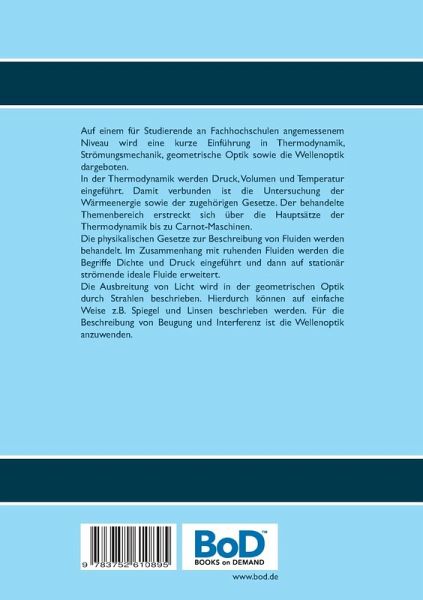 Auf einem für Studierende an Fachhochschulen angemessenem Niveau wird eine kurze Einführung in Thermodynamik, Strömungsmechanik, geometrische Optik sowie die Wellenoptik dargeboten.In der Thermodynamik werden Druck, Volumen und Temperatur eingeführt. Damit verbunden ist die Untersuchung der Wärmeenergie sowie der zugehörigen Gesetze. Der behandelte Themenbereich erstreckt sich über die Hauptsätze der Thermodynamik bis zu Carnot-Maschinen.Die physikalischen Gesetze zur Beschreibung von Fluiden werden behandelt. Im Zusammenhang mit ruhenden Fluiden werden die Begriffe Dichte und Druck eingeführt und dann auf stationär strömende ideale Fluide erweitert.Die Ausbreitung von Licht wird in der geometrischen Optik durch Strahlen beschrieben. Hierdurch können auf einfache Weise z.B.Spiegel und Linsen beschrieben werden. Für die Beschreibung von Beugung und Interferenz ist die Wellenoptik anzuwenden.