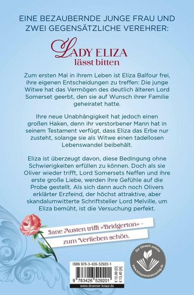 Eliza ist überzeugt davon, diese Bedingung ohne Schwierigkeiten erfüllen zu können. Doch als sie Oliver wieder trifft, Lord Somersets Neffen und ihre erste große Liebe, werden ihre Gefühle auf die Probe gestellt. Schon bald kommen sich die Beiden näher, doch kann ElizaOliver wirklich vertrauen? Als sich dann auch noch Olivers erklärter Erzfeind, der höchst attraktive, aber skandalumwitterte Schriftsteller Lord Melville, um Eliza bemüht, ist die Versuchung perfekt. Aber ist Eliza wirklich schon bereit, ihre neu gewonnene Freiheit wieder aufs Spiel zu setzen?