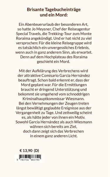 Brisante Tagebucheinträge und ein Mord:Ein Abenteuerurlaub der besonderen Art, so hatte Jo Meysner, Chef der Reiseagentur Special Travels, die Trekking-Tour zum Monte Roraima angekündigt. Und er hat nicht zu viel versprochen: Für die kleine Reisegruppe wird es tatsächlich ein unvergessliches Erlebnis, wenn auch in ganz anderem Sinn, als erwartet. Denn auf dem Hochplateau des Roraima geschieht ein Mord. Mit der Aufklärung des Verbrechens wird der attraktive Comisario Garcia Hernández beauftragt. Schon bald erkennt er, dass der Mord geplant war. Für die Ermittlungen braucht er dringend Unterstützung und bekommt sie umgehend vom schnoddrigen Kriminalhauptkommissar Wiesmann. Bei den Vernehmungen der Zeugen treten längst bewältigt geglaubte Ereignisse aus der Vergangenheit zu Tage. Und zeitweilig scheint es, als hätte jeder von ihnen ein Motiv. Sowohl Garcia Hernández als auch Wiesmann wähnen sich bereits am Ziel, doch dann zeigt sich das Verbrechen in einem ganz anderen Licht.