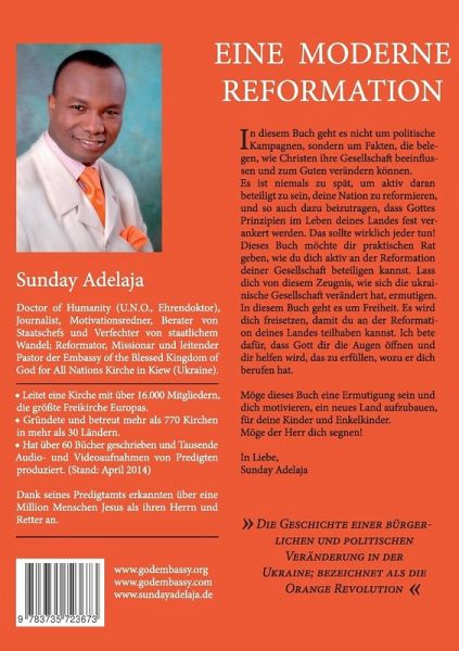 In diesem Buch geht es nicht um politische Kampagnen, sondern um Fakten, die belegen, wie Christen ihre Gesellschaft beeinflussen und zum Guten verändern können.Es ist niemals zu spät, um aktiv daran beteiligt zu sein, deine Nation zu reformieren, und so auch dazu beizutragen, dass Gottes Prinzipien im Leben deines Landes fest verankert werden. Das sollte wirklich jeder tun! Dieses Buch möchte dir praktischen Rat geben, wie du dich aktiv an der Reformation deiner Gesellschaft beteiligen kannst. Lass dich von diesem Zeugnis, wie sich die ukrainische Gesellschaft verändert hat, ermutigen.Ich bin davon überzeugt, dass dir dieses Buch helfen wird, die Bürde der Angst abzulegen, die dir durch eine irdische, säkulare Vergangenheit auferlegt worden ist. Es wird dir die Augen dafür öffnen, dass wir es sind, die Menschen einer Nation, die die Zukunft unseres Landes bestimmen und nicht die Politiker, die vom Volk ernannt, aber auch verklagt werden, je nachdem wie gut sie ihren Dienst an uns ausführen.In diesem Buch geht es um Freiheit. Es wird dich freisetzen, damit du an der Reformation deines Landes teilhaben kannst. Ich bete dafür, dass Gott dir die Augen öffnen und dir helfen wird, das zu erfüllen, wozu er dich berufen hat.Möge dieses Buch eine Ermutigung sein und dich motivieren, ein neues Land aufzubauen, für deine Kinder und Enkelkinder.Möge der Herr dich segnen!In Liebe,Sunday Adelaja