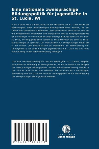 In der Schule Anse la Raye Infant an der Westküste von St. Lucia wurde die Notwendigkeit einer zweisprachigen Bildungsmaßnahme deutlich, als die Lehrer die schriftlichen Arbeiten von Leseschwachen in den Klassen eins bis drei beobachteten, bewerteten und analysierten. Dieses Kampagnenportfolio ist ein Plädoyer für eine nationale zweisprachige Bildungspolitik auf der Insel St. Lucia, wo die Jugendlichen sowohl St. Lucia-Kreolisch als auch St. Lucia-Standardenglisch sprechen. Der Plan plädiert für zweisprachigen Unterricht in der Primar- und Sekundarstufe als Maßnahme zur Verbesserung der Lernergebnisse von zweisprachigen Jugendlichen auf St. Lucia, die eine frühe Unterstützung in der Sprachentwicklung benötigen.