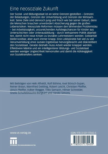 Der Sozial- und Bildungsstaat ist an seine Grenzen gestoßen - Grenzen der Belastungen, Grenzen der Umverteilung und Grenzen der Wirksamkeit. Seine Ziele sind dennoch jung und frisch wie bei seiner Geburt, denn die Menschen brauchen unverändert Absicherung gegen die großen Lebensrisiken. Neosoziale Reformen, die auch die ungewollten negativen Nebenwirkungen und die Einbettung des Sozialstaats in Märkte systematisch einkalkulieren, müssen den lähmenden Problemstau - bei Arbeitslosigkeit, unzureichenden Aufstiegschancen für Kinder aus Unterschichten oder Unterausbildung - durch wirksamere Politik abarbeiten, damit nicht neue Krisen zu brutalen Lehrmeistern werden. Solidarität bleibt kostbar, aber auch immer knapp. Eine Lobbykratie - seit langem zu stark geworden - hat viel zu viel Herumverteilung ohne soziale Ergebnisse hervorgebracht und diskreditiert den Sozialstaat. Gerade deshalb muss Arbeit wieder knapper werden. Effektivere Märkte und ein intelligenterer Bildungs- und Sozialstaat werden weniger Ungleichheit hervorrufen und damit die Abhängigkeit von Sozialtransfers senken.