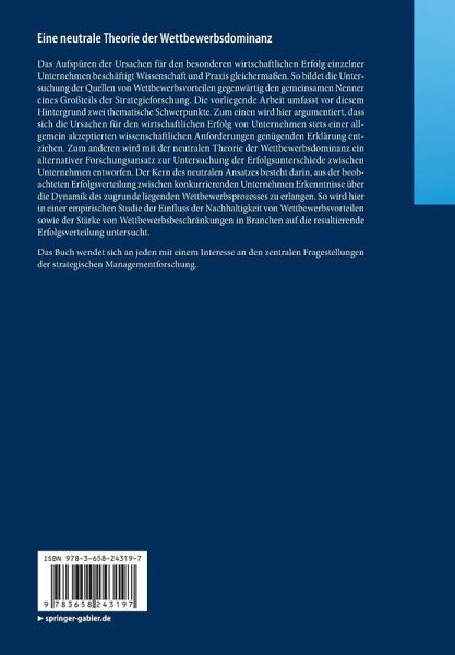 Das Aufspüren der Ursachen für den besonderen wirtschaftlichen Erfolg einzelner Unternehmen beschäftigt Wissenschaft und Praxis gleichermaßen. So bildet die Untersuchung der Quellen von Wettbewerbsvorteilen gegenwärtig den gemeinsamen Nenner eines Großteils der Strategieforschung. Die vorliegende Arbeit umfasst vor diesem Hintergrund zwei thematische Schwerpunkte. Zum einen wird hier argumentiert, dass sich die Ursachen für den wirtschaftlichen Erfolg von Unternehmen stets einer allgemein akzeptierten wissenschaftlichen Anforderungen genügenden Erklärung entziehen. Zum anderen wird mit der neutralen Theorie der Wettbewerbsdominanz ein alternativer Forschungsansatz zur Untersuchung der Erfolgsunterschiede zwischen Unternehmen entworfen. Der Kern des neutralen Ansatzes besteht darin, aus der beobachteten Erfolgsverteilung zwischen konkurrierenden Unternehmen Erkenntnisse über die Dynamik des zugrunde liegenden Wettbewerbsprozesses zu erlangen. So wird hier in einer empirischen Studie der Einfluss der Nachhaltigkeit von Wettbewerbsvorteilen sowie der Stärke von Wettbewerbsbeschränkungen in Branchen auf die resultierende Erfolgsverteilung untersucht.