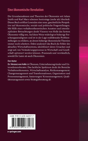 Die Grundannahmen und Theorien der Ökonomie seit Adam Smith und Karl Marx scheinen heutzutage (mehr als) überholt. Dieses Buch eröffnet Lesenden eine neue, ganzheitliche Perspektive auf ökonomische, soziale und politische Fragestellungen. Mit Hilfe eines verhaltenstheoretischen Ansatzes und interdisziplinärer Betrachtungen denkt Vinzenz von Holle das System Ökonomie völlig neu. Auf diese Weise widerlegt er bisherige Forschungsparadigmen und ist in der Lage realitätsnahe Problemstellungen zu erklären, an denen bisherige ökonomische Theorien immer noch scheitern. Dabei analysiert das Buch die Fehler des aktuellen Wirtschaftssystems, identifiziert deren Ursachen und zeigt auf, wie Veränderungsprozesse in Wirtschaft und Gesellschaft optimiert werden können. Praxisnah und verständlich, sowohl für Laien als auch Ökonomen.