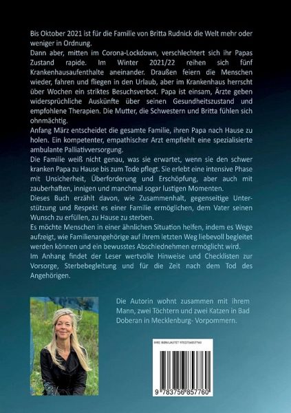 Bis Oktober 2021 ist für die Familie von Britta Rudnick die Welt mehr oder weniger in Ordnung. Dann aber, mitten im Corona-Lockdown, verschlechtert sich ihr Papas Zustand rapide. Im Winter 2021/22 reihen sich fünf Krankenhausaufenthalte aneinander. Draußen feiern die Menschen wieder, fahren und fliegen in den Urlaub, aber im Krankenhaus herrscht über Wochen ein striktes Besuchsverbot. Papa ist einsam, Ärzte geben widersprüchliche Auskünfte über seinen Gesundheitszustand und empfohlene Therapien. Die Mutter, die Schwestern und Britta fühlen sich ohnmächtig.Anfang März entscheidet die gesamte Familie, ihren Papa nach Hause zu holen. Ein kompetenter, empathischer Arzt empfiehlt eine spezialisierte ambulante Palliativversorgung.Die Familie weiß nicht genau, was sie erwartet, wenn sie den schwer kranken Papa zu Hause bis zum Tode pflegt. Sie erlebt eine intensive Phase mit Unsicherheit, Überforderung und Erschöpfung, aber auch mit zauberhaften, innigen und manchmal sogar lustigen Momenten.Dieses Buch erzählt davon, wie Zusammenhalt, gegenseitige Unterstützung und Respekt es einer Familie ermöglichen, dem Vater seinen Wunsch zu erfüllen, zu Hause zu sterben. Es möchte Menschen in einer ähnlichen Situation helfen, indem es Wege aufzeigt, wie Familienangehörige auf ihrem letzten Weg liebevoll begleitet werden können und ein bewusstes Abschiednehmen ermöglicht wird.Im Anhang findet der Leser wertvolle Hinweise und Checklisten zur Vorsorge, Sterbebegleitung und für die Zeit nach dem Tod des Angehörigen.