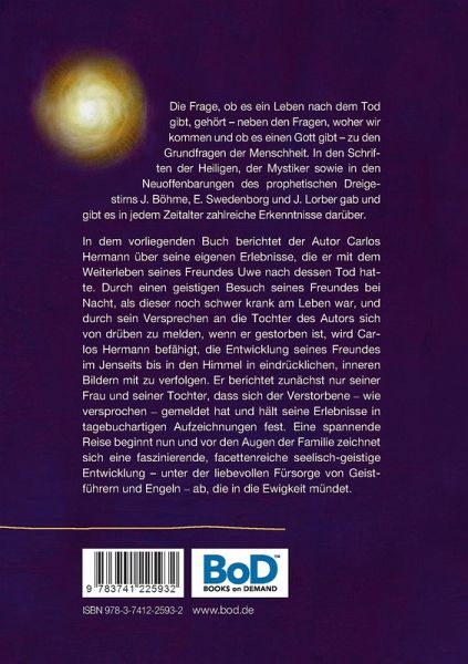 Die Frage, ob es ein Leben nach dem Tod gibt, gehört - neben den Fragen, woher wir kommen und ob es einen Gott gibt - zu den Grundfragen der Menschheit. In den Schriften der Heiligen, der Mystiker sowie in den Neuoffenbarungen des prophetischen Dreigestirns J. Böhme, E. Swedenborg und J. Lorber gab und gibt es in jedem Zeitalter zahlreiche Erkenntnisse darüber.In dem vorliegenden Buch berichtet der Autor Carlos Hermann über seine eigenen Erlebnisse, die er mit dem Weiterleben seines Freundes Uwe nach dessen Tod hatte. Durch einen geistigen Besuch seines Freundes bei Nacht, als dieser noch schwer krank am Leben war, und durch sein Versprechen an die Tochter des Autors, sich von drüben zu melden, wenn er gestorben ist, wird Carlos Hermann befähigt, die Entwicklung seines Freundes im Jenseits bis in den Himmel in eindrücklichen, inneren Bildern mitzuverfolgen. Er berichtet zunächst nur seiner Frau und seiner Tochter, dass sich der Verstorbene - wie versprochen - gemeldet hat und hält seine Erlebnisse in tagebuchartigen Aufzeichnungen fest. Eine spannende Reise beginnt nun und vor den Augen der Familie zeichnet sich eine faszinierende, facettenreiche seelisch-geistige Entwicklung - unter der liebevollen Fürsorge von Geistführern und Engeln - ab, die in die Ewigkeit mündet.