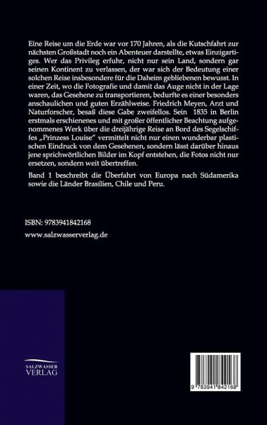 Eine Reise um die Erde war vor 170 Jahren, als die Kutschfahrt zur nächsten Großstadt noch ein Abenteuer darstellte, etwas Einzigartiges. Wer das Privileg erfuhr, nicht nur sein Land, sondern gar seinen Kontinent zu verlassen, der war sich der Bedeutung einer solchen Reise insbesondere für die Daheim gebliebenen bewusst. In einer Zeit, wo die Fotografie und damit das Auge nicht in der Lage waren, das gesehene zu transportieren, bedurfte es einer besonders anschaulichen und guten Erzählweise. Friedrich Meyen, Arzt und Naturforscher, besaß diese Gabe zweifellos. Sein 1835 in Berlin erstmals erschienenes und mit großer öffentlicher Beachtung aufgenommenes Werk über die dreijährige Reise an Bord des Segelschiffes 'Prinzess Louise' vermittelt nicht nur einen wunderbar plastischen Eindruck von dem Gesehenen, sondern lässt darüber hinaus jene sprichwörtlichen Bilder im Kopf entstehen, die Fotos nicht nur ersetzen, sondern weit übertreffen.