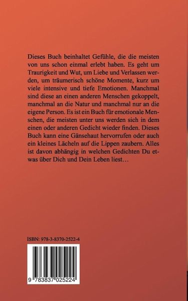 Dieses Buch beinhaltet Gefühle, die die meisten von uns schon einmal erlebt haben. Es geht um Traurigkeit und Wut, um Liebe und Verlassen werden, um träumerisch schöne Momente, kurz um viele intensive und tiefe Emotionen. Manchmal sind diese an einen anderen Menschen gekoppelt, manchmal an die Natur und manchmal nur an die eigene Person. Es ist ein Buch für emotionale Menschen, die meisten unter uns werden sich in dem einen oder anderen Gedicht wieder finden. Dieses Buch kann eine Gänsehaut hervorrufen oder auch ein kleines Lächeln auf die Lippen zaubern. Alles ist davon abhängig in welchen Gedichten Du etwas über Dich und Dein Leben liest...