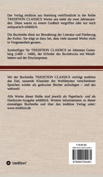 Diese Hardcover-Ausgabe ist Teil der TREDITION CLASSICS. Der Verlag tredition aus Hamburg veröffentlicht in der Buchreihe TREDITION CLASSICS Werke aus mehr als zwei Jahrtausenden. Diese waren zu einem Großteil vergriffen oder nur noch antiquarisch erhältlich. Mit TREDITION CLASSICS verfolgt tredition das Ziel, tausende Klassiker der Weltliteratur verschiedener Sprachen wieder als gedruckte Bücher zu verlegen und das weltweit! Die Buchreihe dient zur Bewahrung der Literatur und Förderung der Kultur. Sie trägt so dazu bei, dass viele tausend Werke nicht in Vergessenheit geraten.