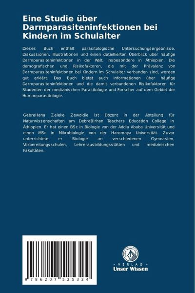 Dieses Buch enthält parasitologische Untersuchungsergebnisse, Diskussionen, Illustrationen und einen detaillierten Überblick über häufige Darmparasiteninfektionen in der Welt, insbesondere in Äthiopien. Die demografischen und Risikofaktoren, die mit der Prävalenz von Darmparasiteninfektionen bei Kindern im Schulalter verbunden sind, werden gut erklärt. Das Buch bietet auch Informationen über häufige Darmparasiteninfektionen und die damit verbundenen Risikofaktoren für Studenten der medizinischen Parasitologie und Forscher auf dem Gebiet der Humanparasitologie.
