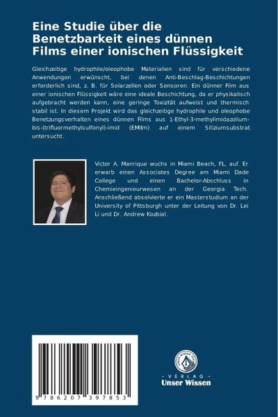 Gleichzeitige hydrophile/oleophobe Materialien sind für verschiedene Anwendungen erwünscht, bei denen Anti-Beschlag-Beschichtungen erforderlich sind, z. B. für Solarzellen oder Sensoren. Ein dünner Film aus einer ionischen Flüssigkeit wäre eine ideale Beschichtung, da er physikalisch aufgebracht werden kann, eine geringe Toxizität aufweist und thermisch stabil ist. In diesem Projekt wird das gleichzeitige hydrophile und oleophobe Benetzungsverhalten eines dünnen Films aus 1-Ethyl-3-methylimidazolium-bis-(trifluormethylsulfonyl)-imid (EMIIm) auf einem Siliziumsubstrat untersucht.