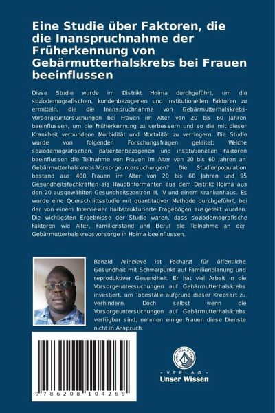 Diese Studie wurde im Distrikt Hoima durchgeführt, um die soziodemografischen, kundenbezogenen und institutionellen Faktoren zu ermitteln, die die Inanspruchnahme von Gebärmutterhalskrebs-Vorsorgeuntersuchungen bei Frauen im Alter von 20 bis 60 Jahren beeinflussen, um die Früherkennung zu verbessern und so die mit dieser Krankheit verbundene Morbidität und Mortalität zu verringern. Die Studie wurde von folgenden Forschungsfragen geleitet: Welche soziodemografischen, patientenbezogenen und institutionellen Faktoren beeinflussen die Teilnahme von Frauen im Alter von 20 bis 60 Jahren an Gebärmutterhalskrebs-Vorsorgeuntersuchungen? Die Studienpopulation bestand aus 400 Frauen im Alter von 20 bis 60 Jahren und 95 Gesundheitsfachkräften als Hauptinformanten aus dem Distrikt Hoima aus den 20 ausgewählten Gesundheitszentren III, IV und einem Krankenhaus. Es wurde eine Querschnittsstudie mit quantitativer Methode durchgeführt, bei der von einem Interviewer halbstrukturierte Fragebögen ausgeteilt wurden. Die wichtigsten Ergebnisse der Studie waren, dass soziodemografische Faktoren wie Alter, Familienstand und Beruf die Teilnahme an der Gebärmutterhalskrebsvorsorge in Hoima beeinflussen.
