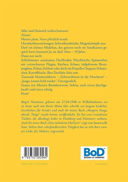 Silke und Heinrich wollen heiraten!Alarm!Mutter plant, Vater plötzlich krank. Herzrhythmusstörungen, Schweißausbrüche, Magenkrämpfe usw.Darf ein kleines Mädchen, das gestern noch im Sandkasten gespielt hatte heiraten? Ja, sie darf. Alter - 19 Jahre. Dann nur noch:Schlafzimmer ausräumen, Dachboden, Waschküche, Spinnweben mit vertrockneten Fliegen, Kirchen, Schnee, tiefgefrorene Brautjungfern, Polizei, Schleier oder doch ein Propeller? Suppen, Schnittchen, Kartoffelsalat, Bier, Eierlikör, Sekt usw. Tanzende Marinesoldaten - "Schwarzbraun ist die Haselnuss" - "Junge, komm bald wieder". Unvergesslich.Genau wie Mutters Brombeerwein. Schön, auch etwas durchgeknallt und etwas schräg. Prost!
