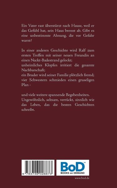 Ein Vater rast überstürzt nach Hause, weil er das Gefühl hat, sein Haus brennt ab. Gibt es eine unbestimmte Ahnung, die vor Gefahr warnt? In einer anderen Geschichte wird Ralf zum ersten Treffen mit seiner neuen Freundin an einen Nackt-Badestrand gelockt;unheimliches Klopfen irritiert die gesamte Nachbarschaft;ein Bruder wird seiner Familie plötzlich fremd;vier Schwestern schmieden einen gruseligen Plan - und viele weitere spannende Begebenheiten.Ungewöhnlich, seltsam, verrückt, sinnlich wie das Leben, das die besten Geschichten schreibt.