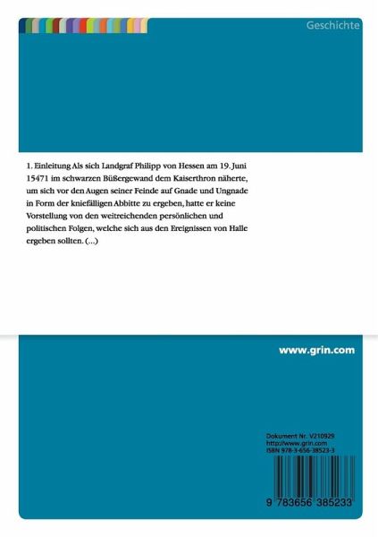Studienarbeit aus dem Jahr 2011 im Fachbereich Geschichte Europa - and. Länder - Mittelalter, Frühe Neuzeit, Note: 1,0, Philipps-Universität Marburg (FB 06: Seminar für Neuere Geschichte - Frühe Neuzeit), Veranstaltung: Reichstage und Reichsregimente 1495-1555, Sprache: Deutsch, Abstract: 1. EinleitungAls sich Landgraf Philipp von Hessen am 19. Juni 15471 im schwarzen Büßergewand dem Kaiserthron näherte, um sich vor den Augen seiner Feinde auf Gnade und Ungnade in Form der kniefälligen Abbitte zu ergeben, hatte er keine Vorstellung von den weitreichenden persönlichen und politischen Folgen, welche sich aus den Ereignissen von Halle ergeben sollten. Bis zuletzt hatte er daran geglaubt, dass er, wie nach dem siegreichen württembergischen Feldzug von 1534, als er sich schon einmal zu einem Fußfall vor dem Kaiser verpflichtet hatte, den Ort des Geschehens als freier Mann verlassen könne. Sorge bereitete ihm jedoch bis zum Schluss die Formel der Ergebung auf Gnade und Ungnade, welche in der Kapitulationsurkunde vereinbart worden war.Es kam jedoch anders, als Philipp es zu erwarten vermocht hatte. Statt einer Gnadenerweisung und Freilassung durch Karl V., geriet er für fünf lange Jahre in kaiserliche Gefangenschaft. Infolge des Fußfalls brach der Widerstand gegen den Kaiser endgültig zusammen. Der Schmalkaldische Bund war zerschlagen. Nach der Rückkehr Philipps war sein Land durch Krieg, Besatzung und Reparationskosten völlig verarmt, sodass er seine letzten Lebensjahre und seine ganze Kraft auf den Wiederaufbau verwandt.