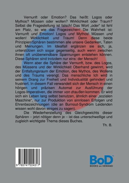 Vernunft oder Emotion? Das heißt: Logos oder Mythos? Müssen oder wollen? Wirklichkeit oder Traum? Selbst die Fragestellung ist falsch! Die Wahrheit ist: Vernunft und Emotion! Logos und Mythos! Müssen und wollen! Wirklichkeit und Traum! Denn diese beide Prinzipien/Sphären bestimmen alle unsere Gedanken, Taten und Meinungen. Diese Sphären sind nur eins: der Mensch!Wenn aber die Sphäre der Vernunft, bzw. des Logos, des Müssens und der Wirklichkeit Oberhand gewinnt, wird der Entfaltungsraum der Emotion, des Mythos, des Wollens und des Traums verengt. Das menschliche Ich wird in seinem Drang zur Freiheit und Individualität gehindert und frustriert.Die Wiederherstellung des Gleichgewichts dieser Sphären - jetzt nötiger denn je - ist das unterschwellige und zugleich wichtigste Thema dieses Buches.