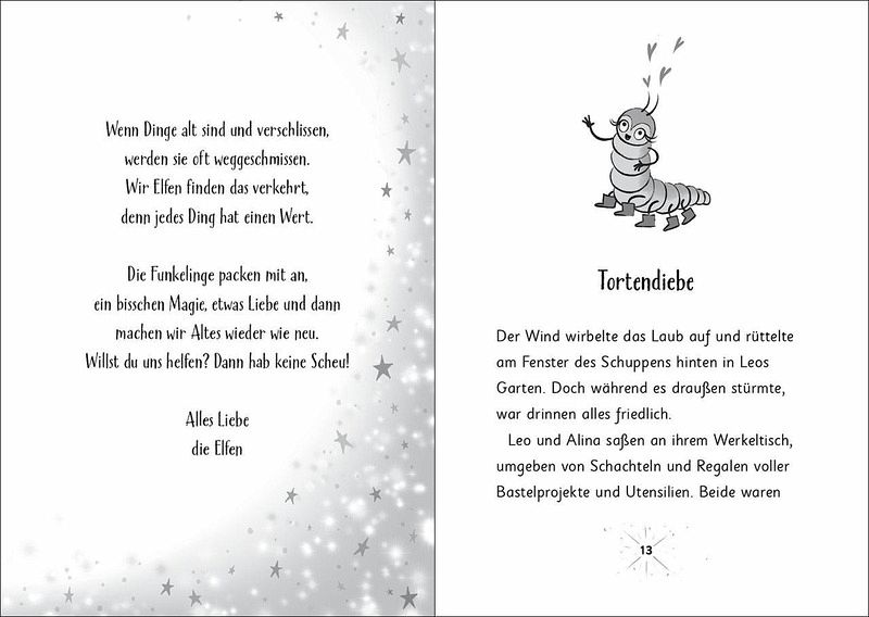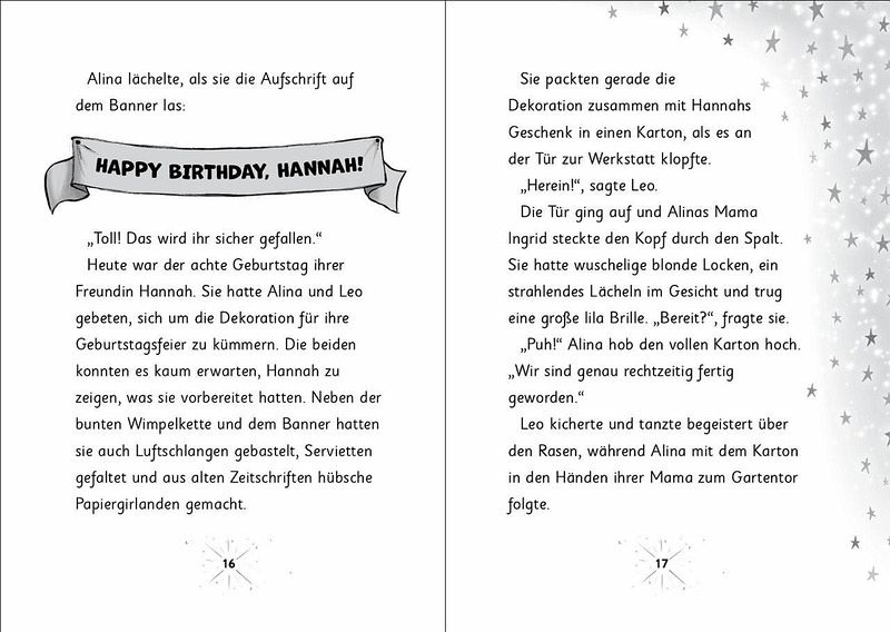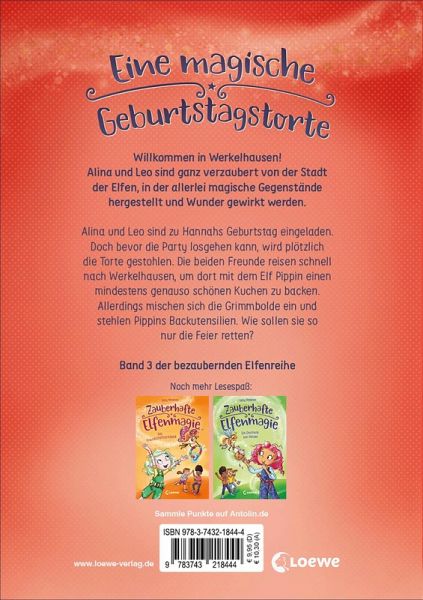 Glitzermagie und Werkelwunder Alina und Leo sind zu Hannahs Geburtstagsfeier eingeladen. Das wird bestimmt ein fantastischer Tag, mit selbst gebastelter Deko und einer riesigen Torte. Doch da wird der Kuchen plötzlich gestohlen und Hannah ist am Boden zerstört. Alina und Leo reisen schnell nach Werkelhausen, um dort mit dem Elf Pippin einen mindestens genauso schönen Kuchen zu backen. Allerdings mischen sich die Grimmbolde Grimmel und Grumma ein und stehlen Pippins Backwerkzeug. Wie sollen sie so nur Hannahs Geburtstag retten?