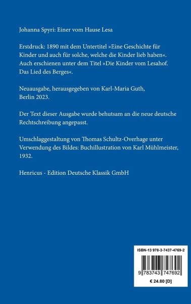 Johanna Spyri: Einer vom Hause LesaErstdruck: 1890 mit dem Untertitel »Eine Geschichte für Kinder und auch für solche, welche die Kinder lieb haben«. Auch erschienen unter dem Titel »Die Kinder vom Lesahof. Das Lied des Berges«.Neuausgabe, herausgegeben von Karl-Maria Guth, Berlin 2023.Der Text dieser Ausgabe wurde behutsam an die neue deutsche Rechtschreibung angepasst.Umschlagabbildung: Buchillustration von Karl Mühlmeister, 1932Gesetzt aus der Minion Pro, 11 pt.Henricus - Edition Deutsche Klassik GmbH