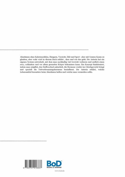 Abnehmen ohne Kalorienzählen, Hungern, Verzicht, Diät und Sport - aber mit Genuss. Kaum zu glauben, aber wahr! In diesem wird Buch erklärt , dass und wie das geht. Die Autorin hat ein eigenes System entwickelt, mit dem man nachhaltig viel Gewicht verlieren und endlich einen sexy, schlanken und vor allem gesunden Körper bekommen kann. Das Konzept funktioniert, indem man entgiftet, den Stoffwechsel ankurbelt, die Hormone wieder ins Gleichgewicht bringt und speziell die Fettverbrennungshormone beeinflusst. Die Autorin erklärt, welche Lebensmittel besonders beim Abnehmen helfen und welche man vermeiden sollte.