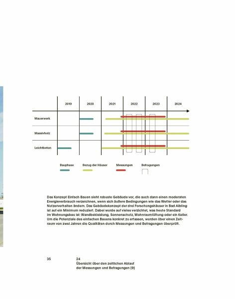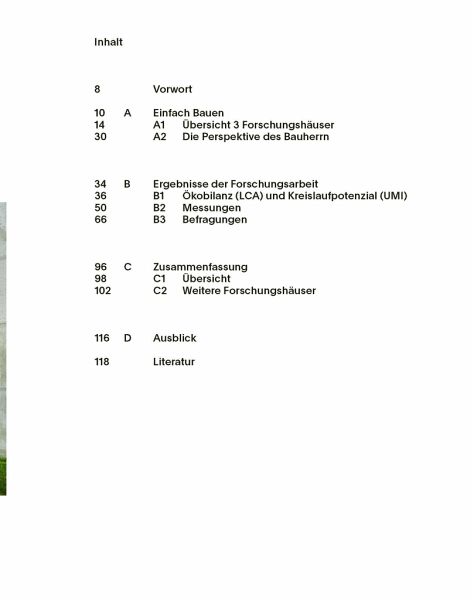 Das Buch präsentiert die Auswertung der Langzeitmessungen an drei Forschungshäusern aus Massivholz, Mauerwerk und Leichtbeton in monolithischer Bauweise und liefert Erkenntnisse, inwiefern die Annahmen in der tatsächlichen Nutzung eingetreten sind. Die drei Häuser werden hinsichtlich Umweltwirkung, Kosten und Wohnkomfort verglichen. Befragungen der Bewohnerschaft und eine Fotoserie ergänzen die menschliche Erfahrungsebene. Der transparente Abgleich soll zur breiten Weiterentwicklung von Einfach Bauen beitragen.