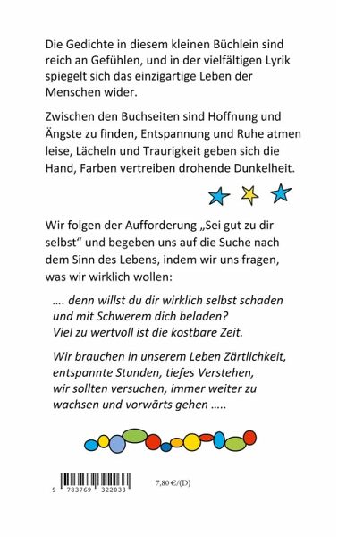 Die Gedichte in diesem kleinen Büchlein sind reich an Gefühlen, und in der vielfältigen Lyrik spiegelt sich das einzigartige Leben der Menschen wider. Zwischen den Buchseiten sind Hoffnung und Ängste zu finden, Entspannung und Ruhe atmen leise, Lächeln und Traurigkeit geben sich die Hand, Farben vertreiben drohende Dunkelheit. Wir folgen der Aufforderung "Sei gut zu dir selbst" und begeben uns auf die Suche nach dem Sinn des Lebens, indem wir uns fragen, was wir wirklich wollen: ..... willst du dir wirklich selbst schaden und mit Schwerem dich beladen? Viel zu wertvoll ist die kostbare Zeit. Wir brauchen in unserem Leben Zärtlichkeit, entspannte Stunden, tiefes Verstehen, wir sollten versuchen, immer weiter zu wachsen und vorwärts gehen .....