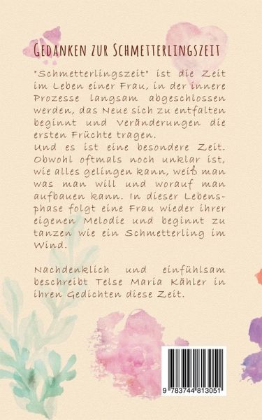 "Schmetterlingszeit" ist die Zeit im Leben einer Frau, in der innere Prozesse langsam abgeschlossen werden, das Neue sich zu entfalten beginnt und Veränderungen die ersten Früchte tragen.Und es ist eine besondere Zeit. Obwohl oftmals noch unklar ist, wie alles gelingen kann, weiß man was man will und worauf man aufbauen kann. In dieser Lebensphase folgt eine Frau wieder ihrer eigenen Melodie und beginnt zu tanzen wie ein Schmetterling im Wind.Nachdenklich und einfühlsam beschreibt Telse Maria Kähler in ihren Gedichten diese Zeit.