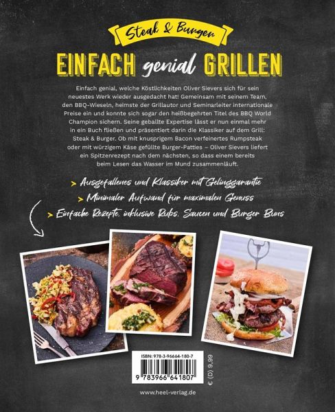 Die Burger-Bibel und das Steak-Paradies für wahre Liebhaber: Einfach genial, welche Köstlichkeiten Oliver Sievers sich für sein neuestes Werk wieder ausgedacht hat! Gemeinsam mit seinem Team, den BBQ-Wieseln, heimste der Grillautor und Seminarleiter internationale Preise ein und konnte sich sogar den heißbegehrten Titel des BBQ World Champion sichern. Seine geballte Expertise lässt er nun einmal mehr in ein Buch fließen und präsentiert darin die Klassiker auf dem Grill: Steak & Burger.Ob mit knusprigem Bacon verfeinertes Rumpsteak oder mit würzigem Käse gefüllte Burger-Patties - Oliver Sievers liefert ein Spitzenrezept nach dem nächsten, so dass einem bereits beim Lesen das Wasser im Mund zusammenläuft: Von Spicy Shrimp Burger über Wagyu-Umami-Burger bis zum Surf & Turf - hier kommen Burger-Novizen und -Professionals ins Schwärmen. Für Steak-Fans bietet der geniale Griller Sievers Ausgefallenes und Klassisches mit Gelinggarantie: Schmetterlingssteak, Skirtsteak, Flanksteak , Flat Iron, Hanging Tender oder T-Bone gefällig? Alles garniert mit leckeren Beilagen!Wie grille ich das perfekte Rumpsteak, ohne es zu einer Schuhsohle verkommen zu lassen? Wie werden meine Burger-Patties saftig und würzig, statt trocken und hart? Und welche Gewürze eignen sich für welches Fleisch am besten? Hier lernt der Leser alle Tipps und Tricks vom Profi himself, verpackt im attraktiven Paket für nur 9,99 EUR. Also ran an die Grills, fertig und los!- Rund 50 Rezepte für nur 9,99 EUR!- Inklusive 20 Rezepten für leckere Rubs, Saucen und perfekte, selbst gebackene Buns vom Black - Bun bis Brioche Bun!- Geniale Fotos!- Minimaler Aufwand für maximalen Genuss!
