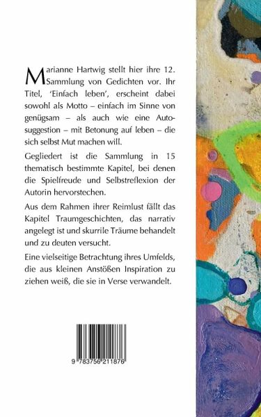 Marianne Hartwig stellt hier ihre 12. Sammlung von Gedichten vor. Ihr Titel, Einfach leben, erscheint dabei sowohl als Motto - einfach im Sinne von genügsam - als auch wie eine Autosuggestion - mit Betonung auf leben - die sich selbst Mut machen will.Gegliedert ist die Sammlung in 15 thematisch bestimmte Kapitel, bei denen die Spielfreude und Selbstreflexion der Autorin hervorstechen.Aus dem Rahmen ihrer Reimlust fällt das Kapitel Traumgeschichten, das narrativ angelegt ist und skurrile Träume behandelt und zu deuten versucht.Eine vielseitige Betrachtung ihres Umfelds, die aus kleinen Anstößen Inspiration zu ziehen weiß, die sie in Verse verwandelt.