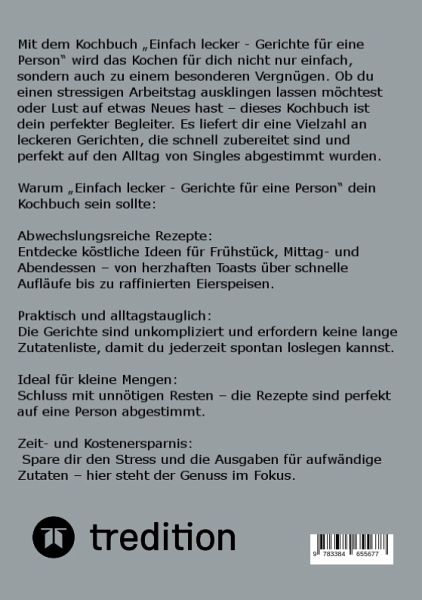 Das Buch "Einfach lecker - Gerichte für eine Person" richtet sich an Menschen, die gerne unkompliziert und schmackhaft kochen möchten, aber nur für sich selbst. Es bietet eine Vielzahl von Rezepten, die speziell auf eine einzelne Person abgestimmt sind, sodass man keine großen Mengen zubereiten muss. Das Buch zeigt, wie man mit einfachen Zutaten und wenig Aufwand leckere Mahlzeiten zaubern kann, die sowohl sättigend als auch abwechslungsreich sind. Es ist ideal für alle, die unabhängig und flexibel essen möchten, ohne auf Geschmack verzichten zu müssen.
