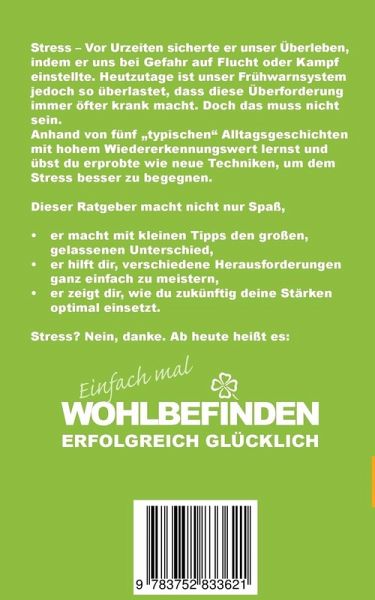 Stress - Vor Urzeiten sicherte er unser Ueberleben, indem er uns bei Gefahr auf Flucht oder Kampf einstellte. Heutzutage ist unser Fruehwarnsystem jedoch so ueberlastet, dass diese Ueberforderung immer oefter krank macht. Doch das muss nicht sein.Anhand von fuenf 'typischen' Alltagsgeschichten mit hohem Wiedererkennungswert lernst und uebst du erprobte wie neue Techniken, um dem Stress besser zu begegnen.Dieser Ratgeber macht nicht nur Spaß,- er macht mit kleinen Tipps den großen, gelassenen Unterschied,- er hilft dir, verschiedene Herausforderungen ganz einfach zu meistern,- er zeigt dir, wie du zukuenftig deine Staerken optimal einsetzt.Stress? Nein, danke. Ab heute heißt es: Einfach mal Wohlbefinden - erfolgreich gluecklich.