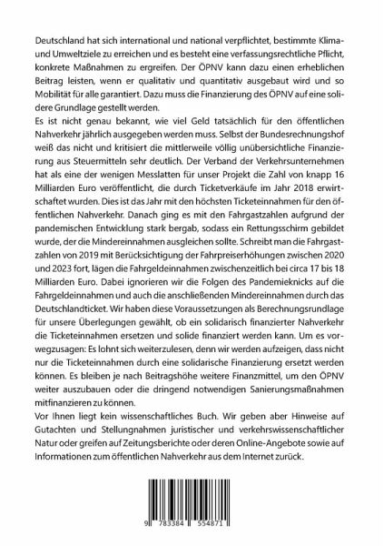 Deutschland hat sich international und national verpflichtet, bestimmte Klima- und Umweltziele zu erreichen und es besteht eine verfassungsrechtliche Pflicht, konkrete Maßnahmen zu ergreifen. Der ÖPNV kann dazu einen erheblichen Beitrag leisten, wenn er qualitativ und quantitativ ausgebaut wird und so Mobilität für alle garantiert. Dazu muss die Finanzierung des ÖPNV auf eine solidere Grundlage gestellt werden. Es ist nicht genau bekannt, wie viel Geld tatsächlich für den öffentlichen Nahverkehr jährlich ausgegeben werden muss. Selbst der Bundesrechnungshof weiß das nicht und kritisiert die mittlerweile völlig unübersichtliche Finanzierung aus Steuermitteln sehr deutlich. Der Verband der Verkehrsunternehmen hat als eine der wenigen Messlatten für unser Projekt die Zahl von knapp 16 Milliarden Euro veröffentlicht, die durch Ticketverkäufe im Jahr 2018 erwirtschaftet wurden. Dies ist das Jahr mit den höchsten Ticketeinnahmen für den öffentlichen Nahverkehr. Danach ging es mit den Fahrgastzahlen aufgrund der pandemischen Entwicklung stark bergab, sodass ein Rettungsschirm gebildet wurde, der die Mindereinnahmen ausgleichen sollte. Schreibt man die Fahrgastzahlen von 2019 mit Berücksichtigung der Fahrpreiserhöhungen zwischen 2020 und 2023 fort, lägen die Fahrgeldeinnahmen zwischenzeitlich bei circa 17 bis 18 Milliarden Euro. Dabei ignorieren wir die Folgen des Pandemieknicks auf die Fahrgeldeinnahmen und auch die anschließenden Mindereinnahmen durch das Deutschlandticket. Wir haben diese Voraussetzungen als Berechnungsrundlage für unsere Überlegungen gewählt, ob ein solidarisch finanzierter Nahverkehr die Ticketeinnahmen ersetzen und solide finanziert werden kann. Um es vorwegzusagen: Es lohnt sich weiterzulesen, denn wir werden aufzeigen, dass nicht nur die Ticketeinnahmen durch eine solidarische Finanzierung ersetzt werden können. Es bleiben je nach Beitragshöhe weitere Finanzmittel, um den ÖPNV weiter auszubauen oder die dringend notwendigen Sanierungsmaßnahmen mitfinanzieren zu können. Vor Ihnen liegt kein wissenschaftliches Buch. Wir geben aber Hinweise auf Gutachten und Stellungnahmen juristischer und verkehrswissenschaftlicher Natur oder greifen auf Zeitungsberichte oder deren Online-Angebote sowie auf Informationen zum öffentlichen Nahverkehr aus dem Internet zurück.